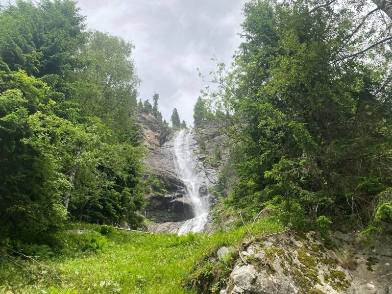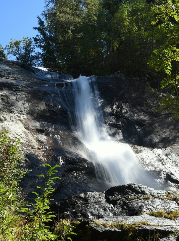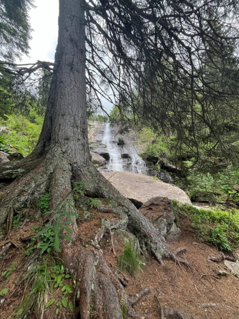 Der Poms-Wasserfall liegt etwa 1 Stunde vom Parkplatz Weinebene entfernt auf einer einfachen, manchmal holprigen Route, ein Gelände, das auch mit kleinen Kindern zu empfehlen ist. Die Landschaft und die Umgebung sind wunderschön, ruhig, die Temperatur entspricht der Höhe, ist aber niedriger als im Tal.