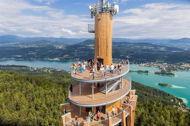 Der höchste holz Aussichtsturm der Welt befindet sich in einem der schönsten Teile Österreichs am Südufer des Wörthsees. Die Struktur auf dem Hügel ist von weitem zu sehen. Es kann mit dem Auto oder Bus von Keutschach am See erreicht werden. Am Fuß des Aussichtspunkts haben Kinder einen Spielplatz und einen Streichelzoo. Der Anblick spricht für sich, das Dorf Maria Wörth am Ufer des Sees liegt fast unter den Füßen des Menschen, ebenso wie der Wörthsee. Mit etwas Glück können wir bei klarem, trockenem Wetter ganz Kärnten bewundern.