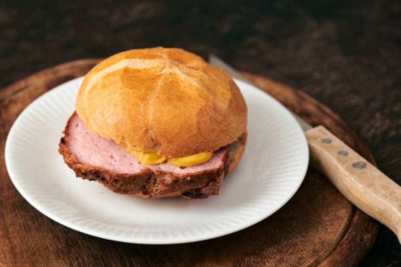 Leberkäse-Sandwich, frisch gebackenes warmes Brötchen mit österreichischem Hackbraten, serviert mit Saucen