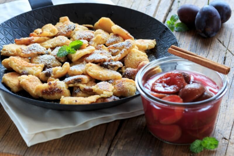 Kaiserschmarrn, eine Delikatesse aus einem weichen, größeren süßen Teig, serviert mit Marmelade und Puderzucker.